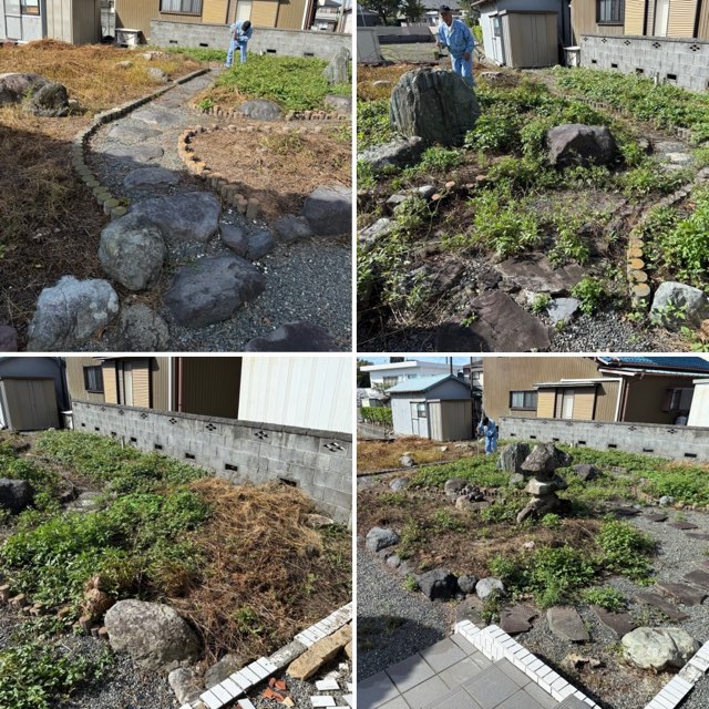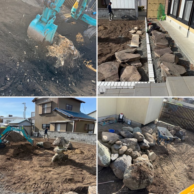 ↓↓↓作業状況 木の根っこを伐根し、再利用できる景石や踏み石を選別しております。